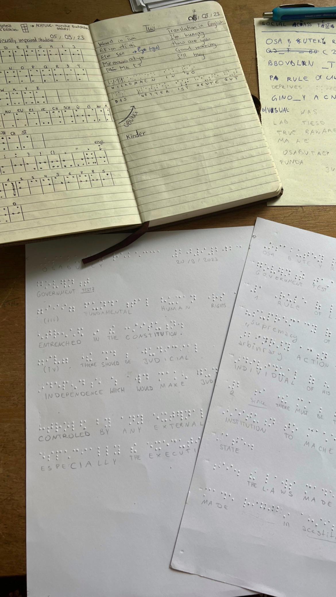 Zwischen den Stunden zahlt sich das Studium dann doch ein bisschen aus – immer wieder werde ich von Schüler/-innen gebeten, ihnen die deutsche Sprache etwas näher zu bringen, was mir super viel Spaß macht. Sind die Freistunden etwas länger, besuche ich das Center für die visually impaired students (die Mawuli High School ist für Schüler/-innen mit und ohne Sehbeeinträchtigung ausgelegt). Hier habe ich von Theresa, einer Freiwilligen die ausschließlich im Center tätig ist, eine kleine Einführung in die Brailleschrift bekommen und übe mich ab und zu darin, erste Abschnitte (bisher hauptsächlich Übungssätze) in die Schwarzschrift zu übersetzen.