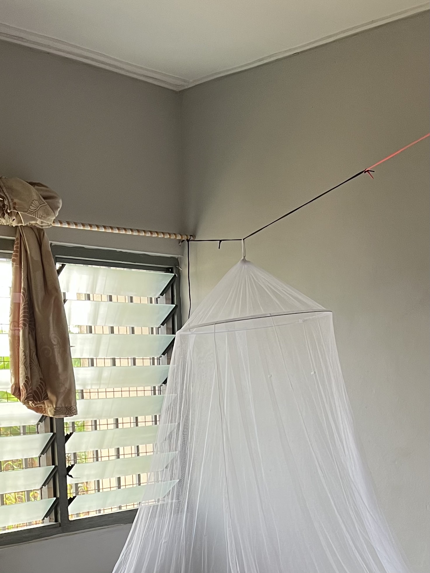 Die erste Woche war zur Eingewöhnung ein bisschen ruhiger. Ich habe erst einmal mein Zimmer eingerichtet, bin dabei an den hohen Decken verzweifelt (die machen es regelrecht unmöglich, ein Mückennetz zu befestigen) und hätte schon fast aufgegeben, bis Bele dann irgendwann mit der Schnürsenkelkonstruktion des Jahrhunderts um die Ecke kam: Man nehme zwei paar Schnürsenkel, knote sie aneinander und spanne sie einmal quer von einer Gardinenstange zur nächsten – Voilà: Problem gelöst!