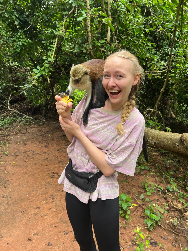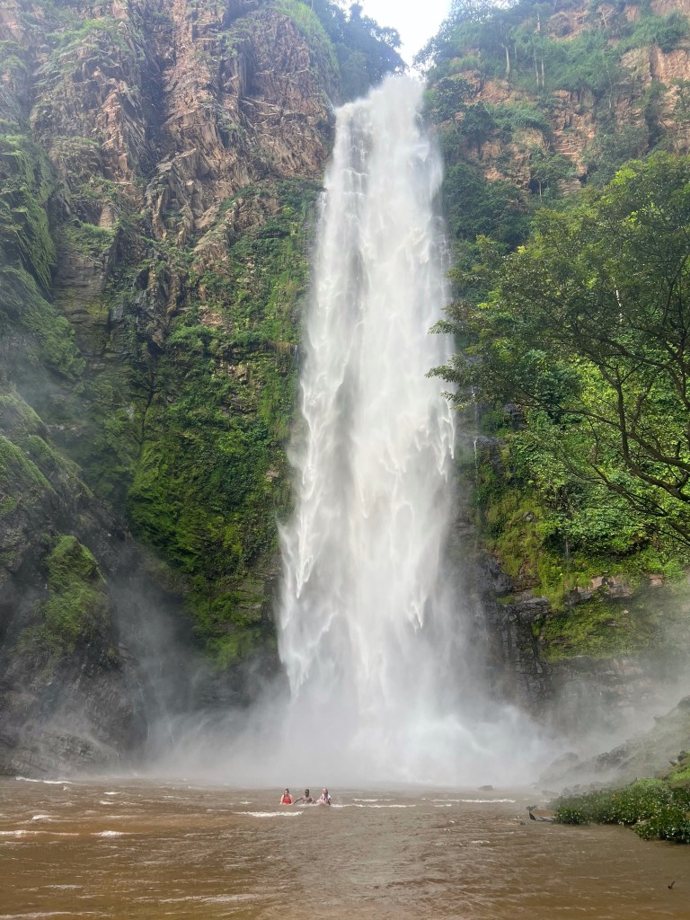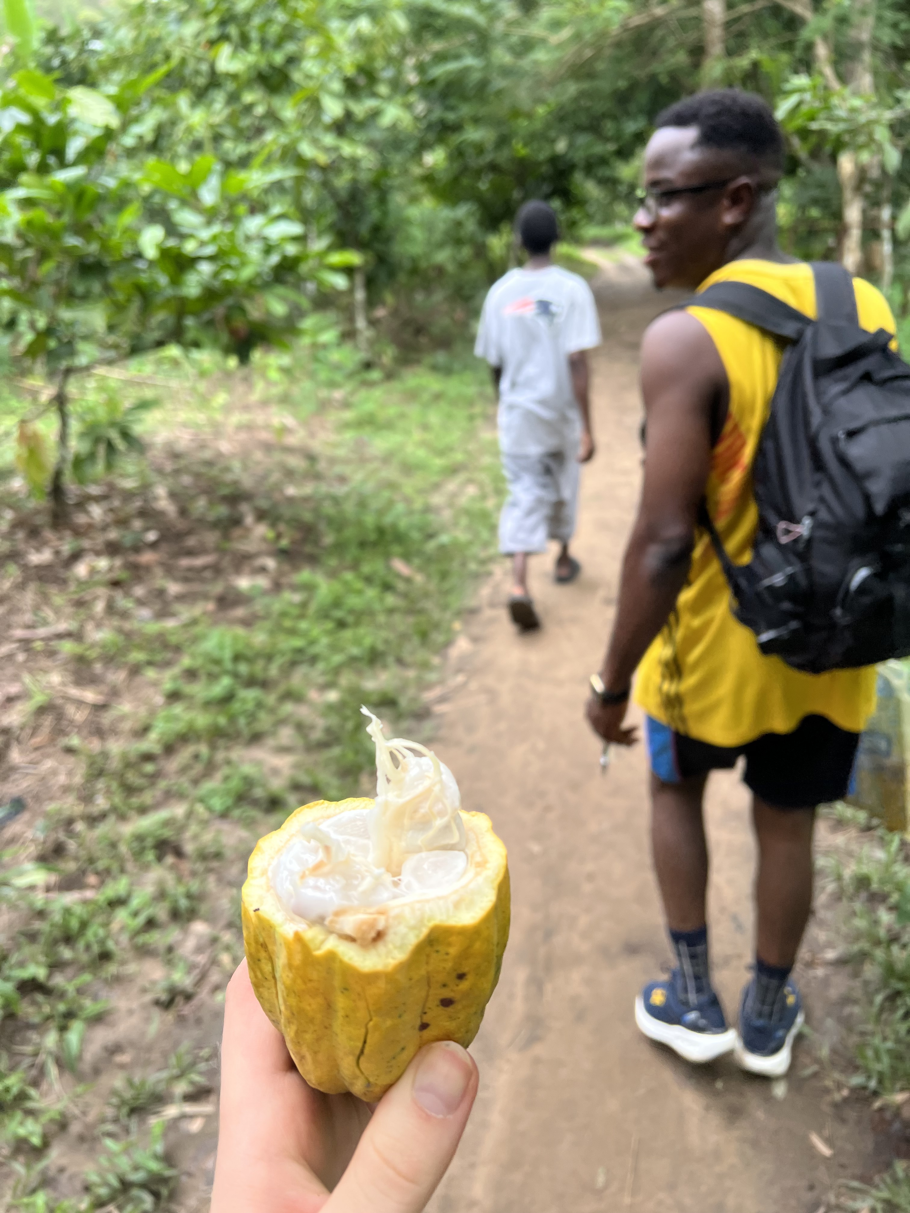 Auch die ein oder andere Sightseeing Tour haben wir schon hinter uns, denn Nelson, der Accountant der E.P. Kekeli International School, hat sich als leidenschaftlicher Tourguide entpuppt. Mit ihm haben wir den Mona Monkeys einen Besuch abgestattet (in der Umgebung leben 13 Familien mit jeweils ca. 120 Affen zusammen, die die Dauer ihrer „Freundschaft“ jedoch auf euren Bananenvorrat beschränken) und sind zu den Wli Agumatsa Waterfalls, den höchsten Wasserfällen Westafrikas, gefahren. Der Weg dorthin führt durch einen beeindruckenden Wald mit lauter Kakaobäumen – wobei ich zugegebener Weise erst einmal nachfragen musste, welche Frucht ich gerade überhaupt in den Händen halte. Dass man eigentlich nur das weiße Fruchtmus essen sollte, das die Samen umgibt (aus diesen wird später Kakao hergestellt), wurde uns allerdings erst gesagt, NACHDEM wir schon beinahe die gesamte Frucht gegessen hatten – natürlich mitsamt der Samen. Lecker war es trotzdem (hat mich ein bisschen an Bucheckern erinnert).