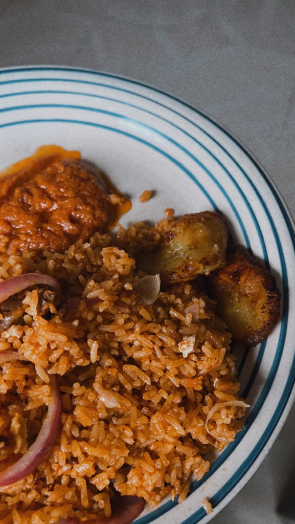 Gemeinsam mit Amma durften wir schon einige ghanaische Gerichte probieren. Zu meinen Favoriten gehören bisher Jollof (ein Reisgericht, das mit Tomatensoße, Zwiebeln, Paprika, Fisch oder Fleisch und verschiedenen Gewürzen zubereitet wird) und Yam (eine Wurzel, die mich rein optisch an eine zu groß geratene Ingwerknolle erinnert, geschmacklich wiederum eher im Bereich der Kartoffel zu verorten ist). Das Ganze zum Frühstück zu essen, fällt mir dann aber doch noch ein bisschen schwer (Fun Fact: ALLE drei Mahlzeiten, die hier an einem Tag gegessen werden, sind warm). Meist schmiere ich mir also einfach eine Schnitte Brot und hoffe, dass mich anschließend niemand nach dem Essen fragt – andernfalls blicke ich in komplett schockierte Gesichter, gefolgt von der Frage, ob das denn alles zum Frühstück gewesen sei und übermäßiger Brotkonsum nicht zu Verstopfungen führen würde.