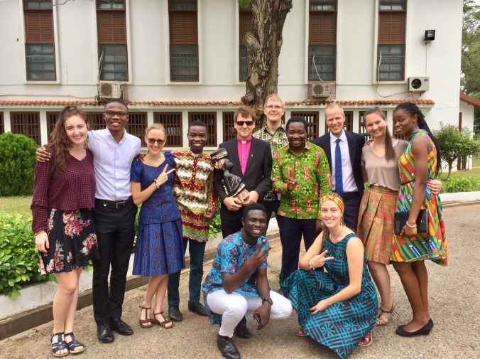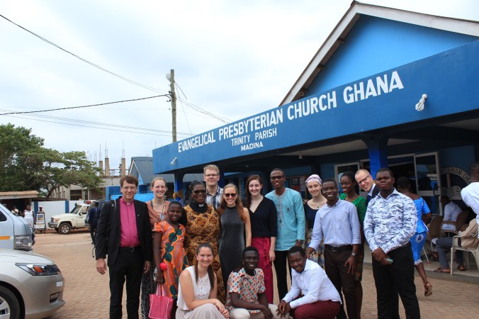 Nach einer ziemlich kurzen Nacht ging es für uns um sieben Uhr zum Frühstück. Dann brachte uns Timothy, unser Fahrer nach Madina EPCG, wo wir die Studierenden von der Legon-Universität zum ersten Mal kennenlernten und mit ihnen den Gottesdienst feierten. Es war ein großer Einführungsgottesdienst für den neuen Moderator des Christian Councils of Ghana, der sich über mehrere Stunden hinzog (wir blieben allerdings nur drei Stunden). Die Veranstaltung wurde begleitet von viel Gesang und einer Predigt des Moderators der EPCG, Rt. Rev. Dr. Seth Agidi. Wir konnten unsere Augen kaum von den vielen Teilnehmern nehmen, die in ihren farbenfrohsten Sonntagskleidern gekommen waren. Teile dieser Predigt ließen uns aufhorchen, da er die schlechten Seiten der Gesellschaft ansprach, die wir als Christen bekämpfen müssen, wie Korruption und Homosexualität. Das führte bei uns zu betroffenen Gesichtern. Mir scheint, dass das Thema der Homosexualität in den beiden Schwesterkirchen in Togo und Ghana momentan vielfach diskutiert und angesprochen wird.