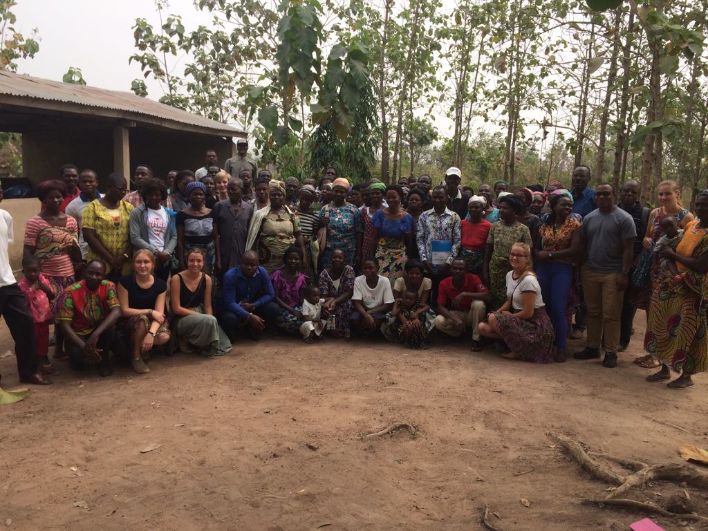 Heute waren wir, die Freiwilligen Hanna und Laura, das Team von CEPRODED sowie Anneke, Jean und Hannes in Kame, wo wir die praktische Seite des Dorfentwicklungsprogrammes kennengelernt haben. In dem Gemeinschaftshaus des Projektes, das auch dem Dorf als Versammlungsraum dient waren vor allem viele Kinder, Frauen und einige Männer versammelt. Die Begegnung beginnt formell mit einer ausführlichen Begrüßung aus der wir erfahren, dass es eine Frauenselbsthilfegruppe, ein Alphabetisierungsteam und die Gruppe „Kinder für Kinder“ gibt, die in ehrenamtlicher Arbeit das Projekt tragen. Die Kinder treffen sich 2 Mal die Wochen und lernen mit Liedern, Spielen und Sketchen Themen für eine gelungene kindliche Entwicklung: Fragen der Gesundheit und Hygiene, Streitschlichtung und ein guter Umgang mit der Umwelt, wie z.B. Bäume gepflanzt und gepflegt werden.